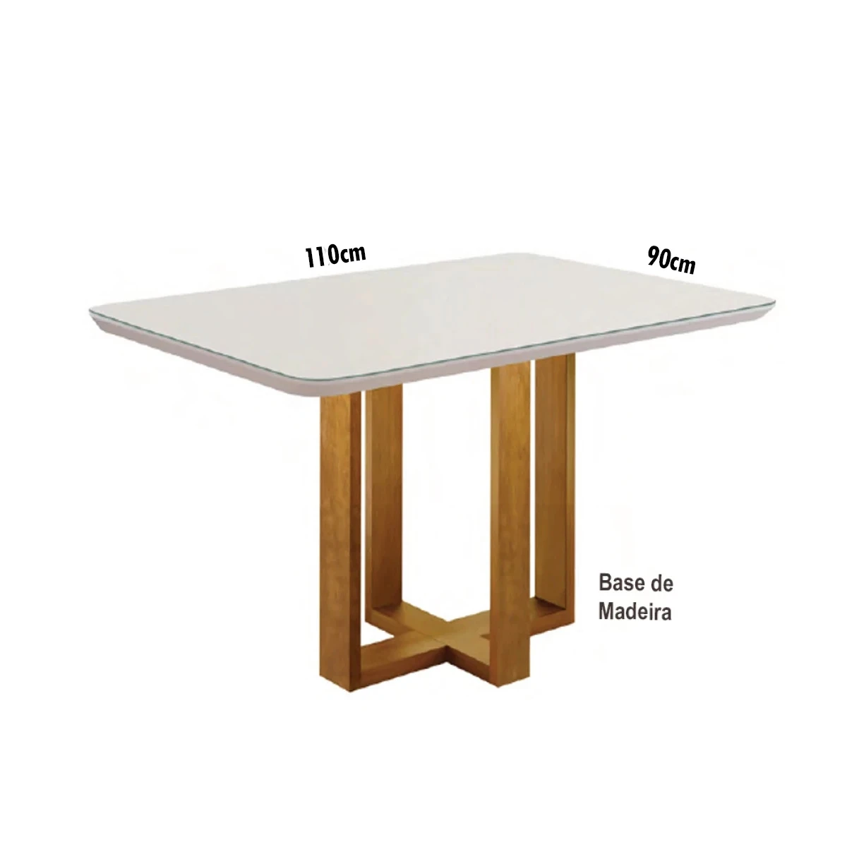 Mesa Imbuia 4 Lugares - Base de Madeira - Canto Moeda - Tampo Vidro Bege