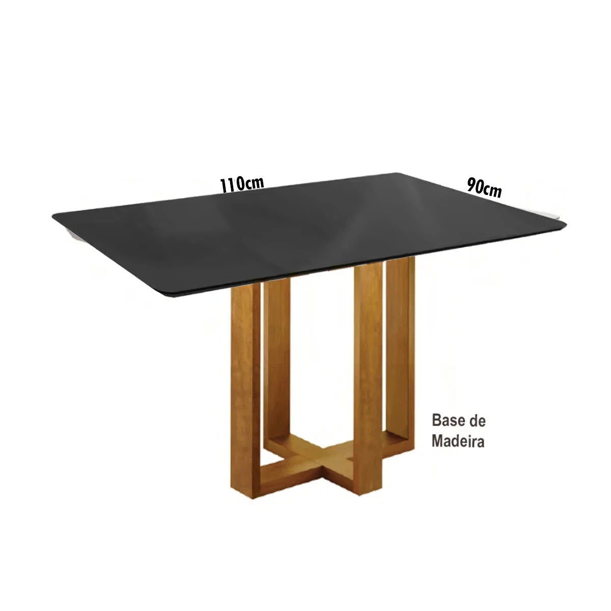 Mesa Imbuia 4 Lugares - Base de Madeira - Canto Moeda - Tampo Vidro Preto